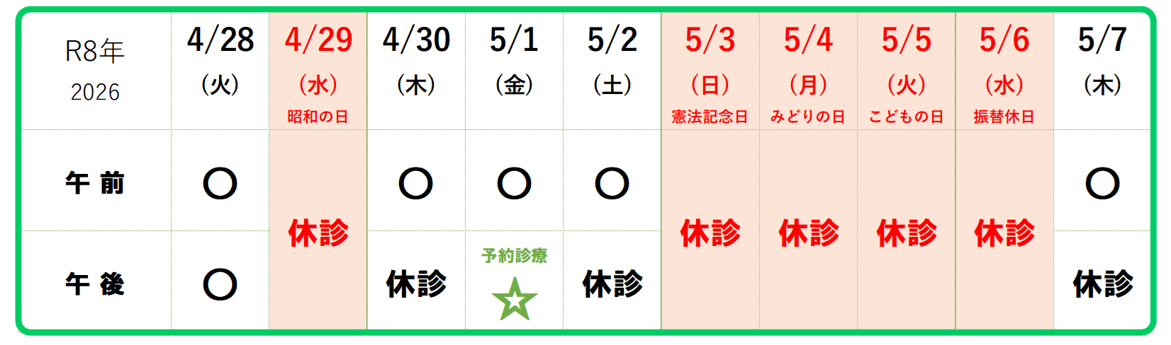 令和8年4月27日(月)の外来診療は学校検診の為、以下の時間になります。